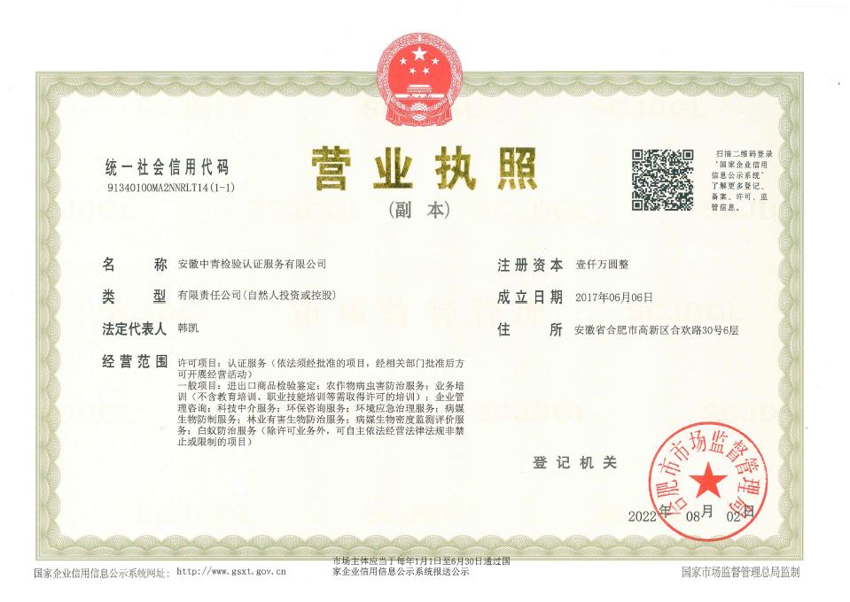 安徽中青檢驗認證服務有限公司成立于2017年6月6日,2018年1月3日通過國家認證認可監督管理委員會批準,現認證領域:質量管理體系、環境管理體系、職業健康安全管理體系、食品安全管理體系、HACCP管理體系、有機產品認證、良好農業規范、服務體系、醫療器械質量管理體系、企業誠信管理體系、食品工業企業誠信管理體系、食安安徽品牌等類別認證。